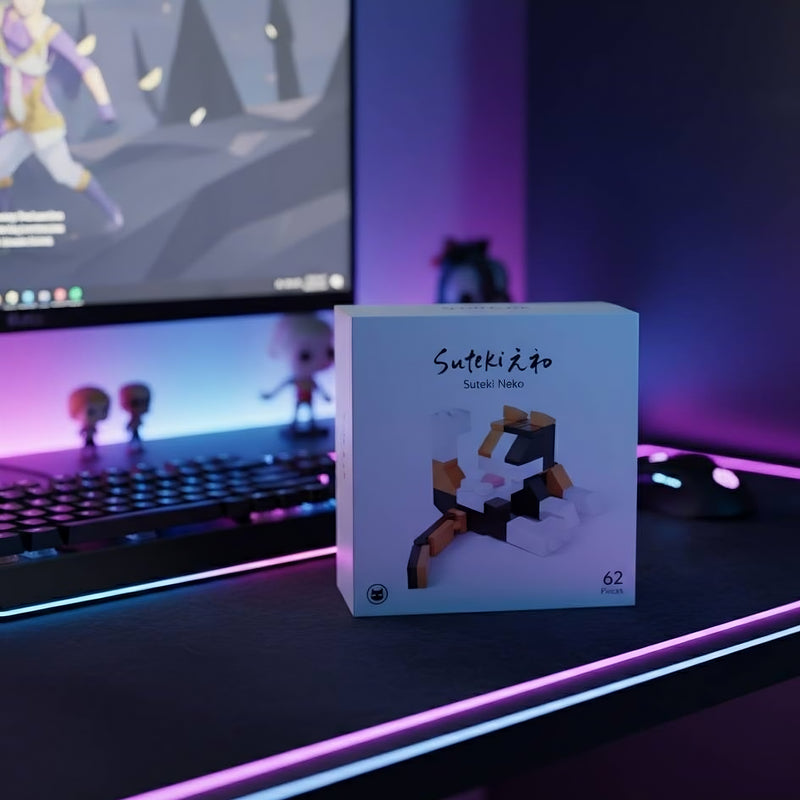 Une fois assemblé, Suteki Neko mesure environ 6 cm. Compact et parfait pour décorer un bureau, une étagère, un setup gaming ou une bibliothèque.